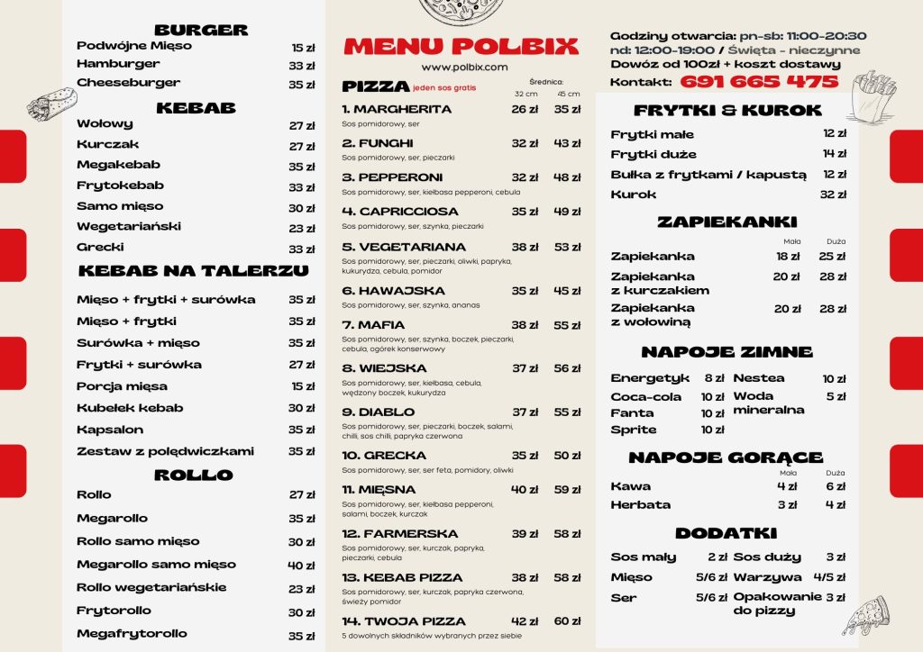 Pobierz menu Polbix i odkryj bogaty wybór pysznych dań – od zestawów obiadowych po aromatyczne kebaby, pizzę i chrupiące zapiekanki. Sprawdź, co dla Ciebie przygotowaliśmy! 🍕🥙